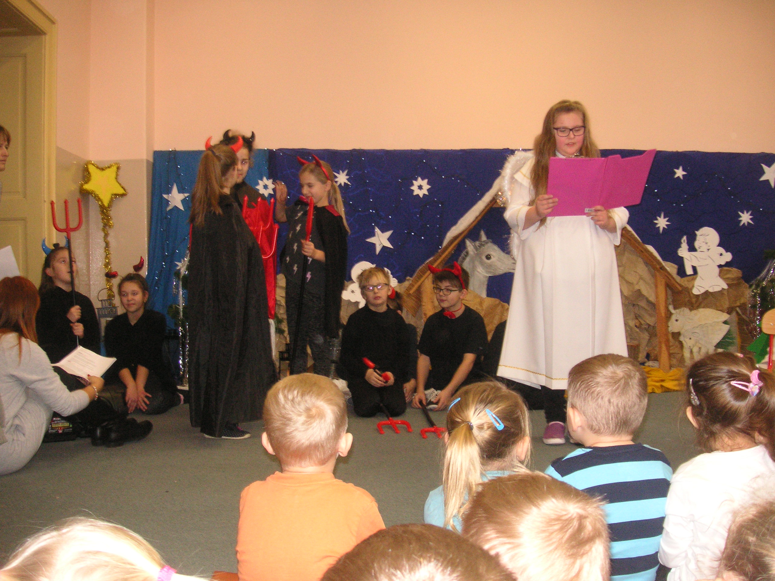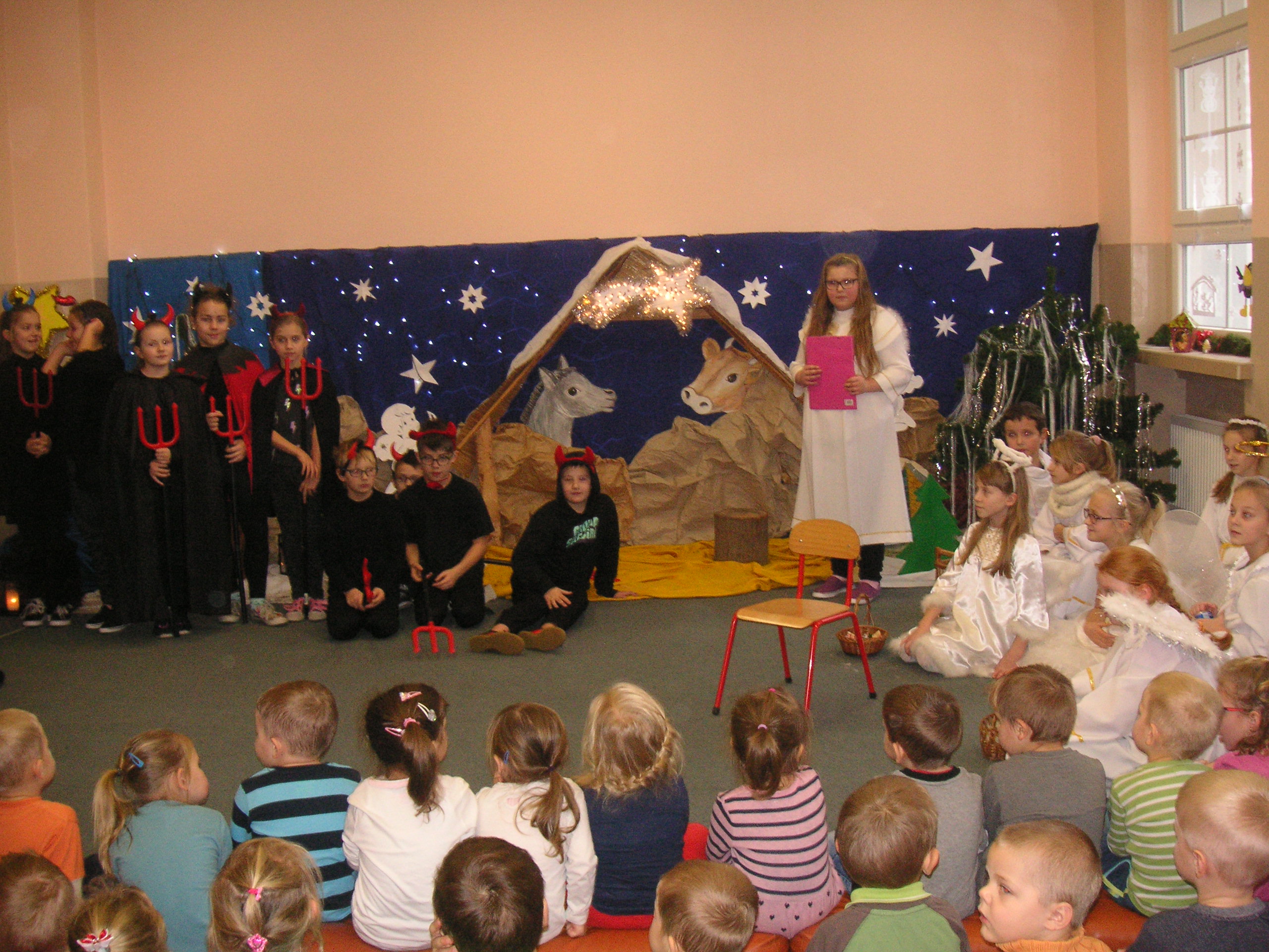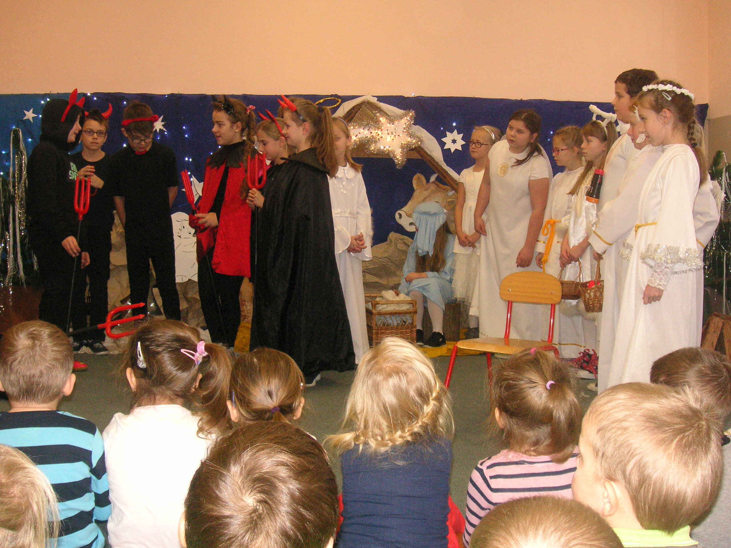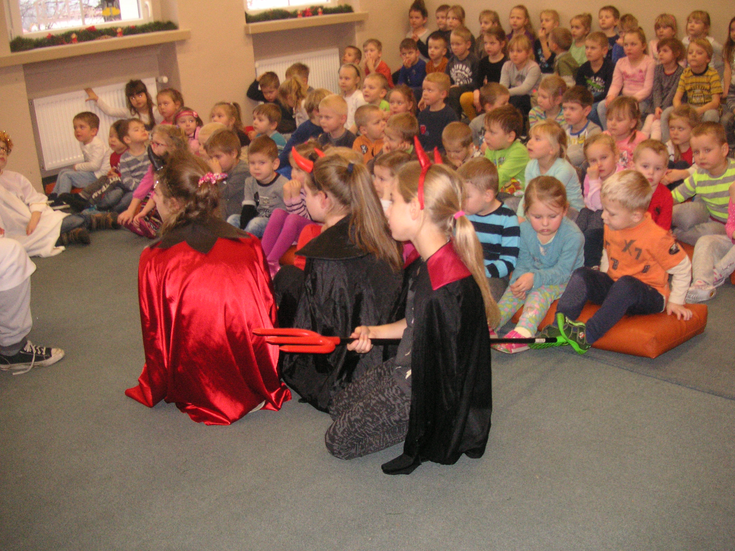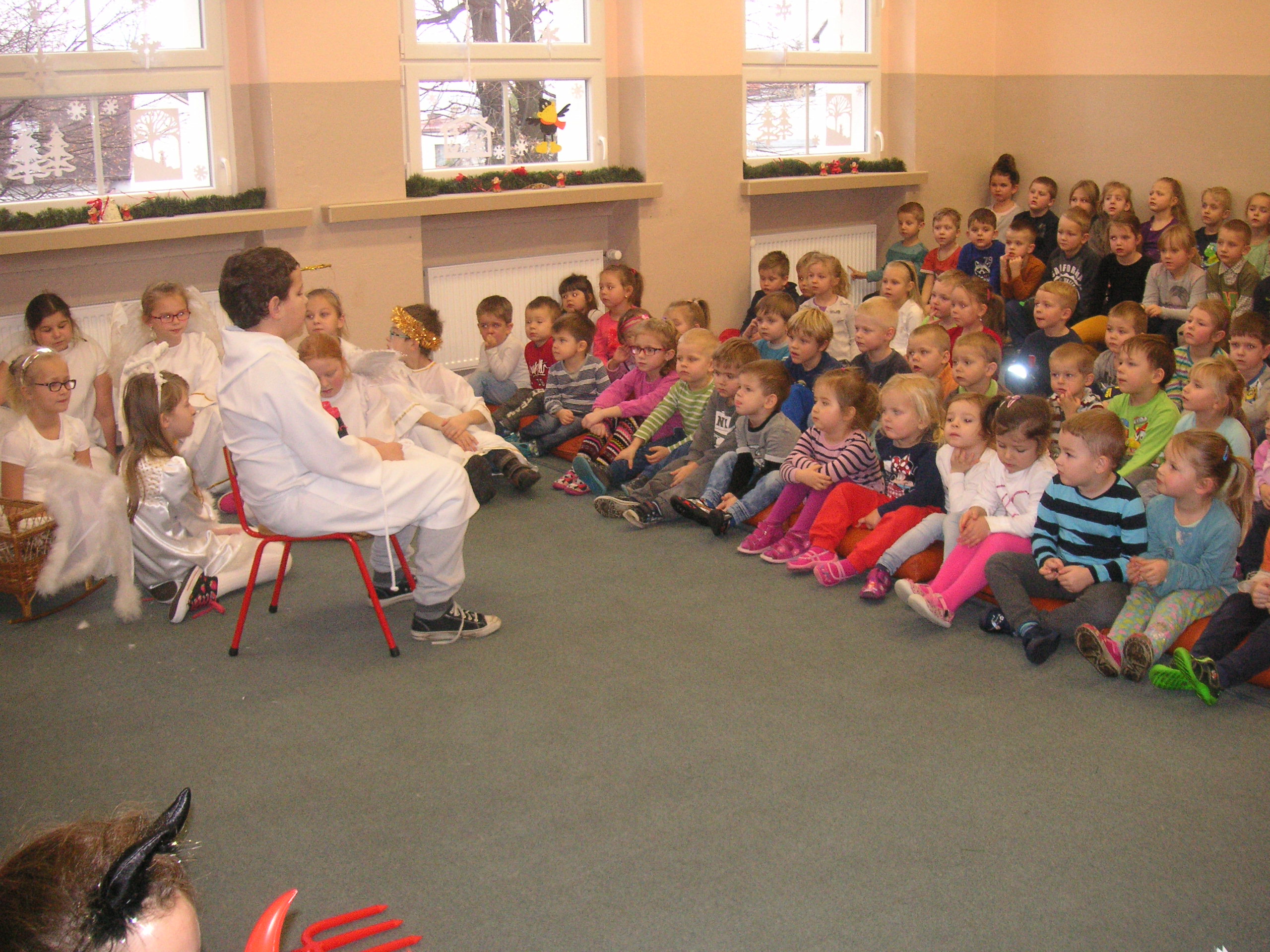 19 grudnia przybyły do naszego przedszkola diabły i anioły z Jasełkami. Uczniowie klas III-ich wraz ze swoimi nauczycielami, zaprezentowali przedszkolakom opowieść bożonarodzeniową. Dzieci z wielką uwagą i emocjami śledziły występy szkolnych kolegów. Miło spędzili z nimi czas, a otrzymane od uczniów świąteczne gwiazdki wywołały na buziach przedszkolaków szeroki uśmiech. Dziękujemy i zapraszamy ponownie.