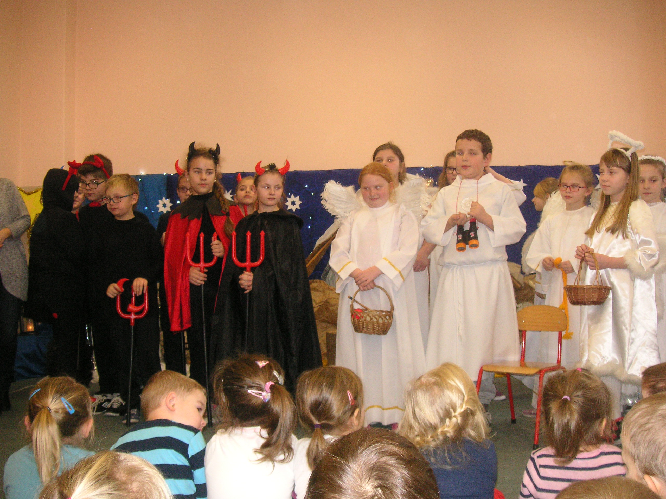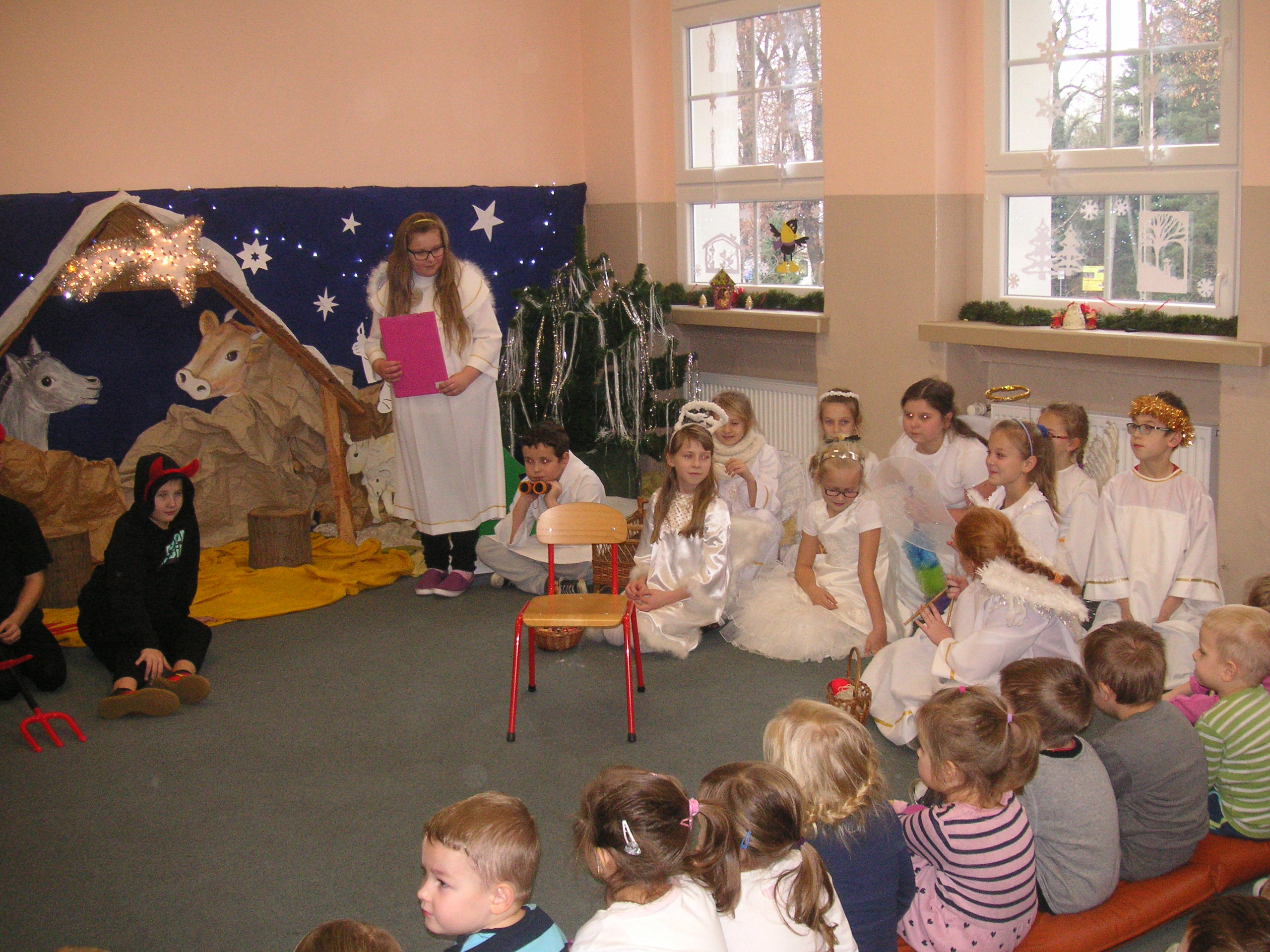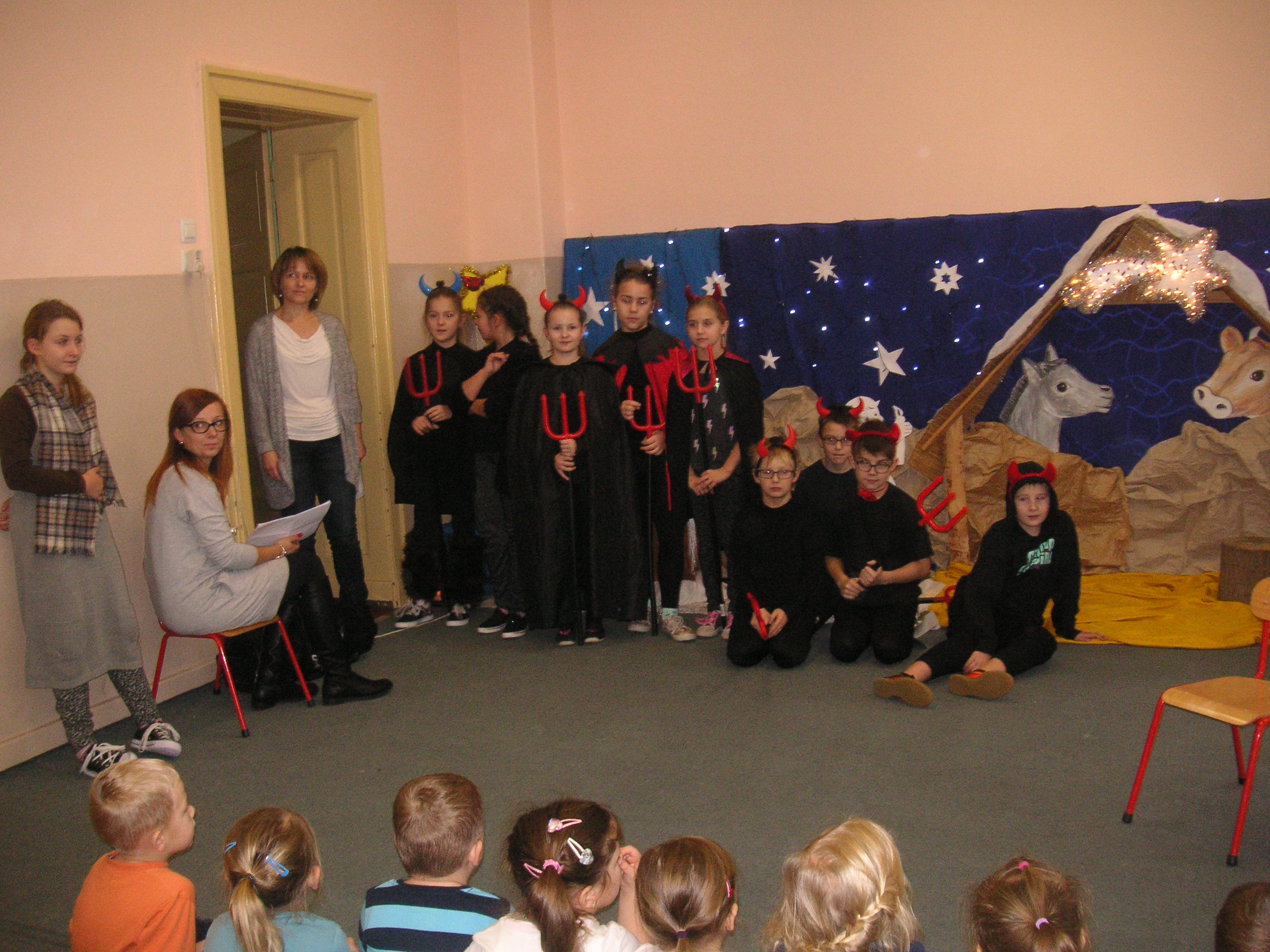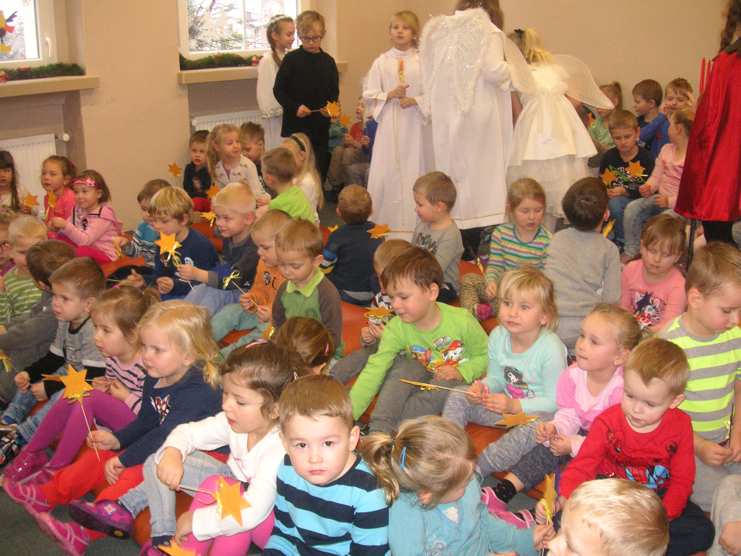 19 grudnia przybyły do naszego przedszkola diabły i anioły z Jasełkami. Uczniowie klas III-ich wraz ze swoimi nauczycielami, zaprezentowali przedszkolakom opowieść bożonarodzeniową. Dzieci z wielką uwagą i emocjami śledziły występy szkolnych kolegów. Miło spędzili z nimi czas, a otrzymane od uczniów świąteczne gwiazdki wywołały na buziach przedszkolaków szeroki uśmiech. Dziękujemy i zapraszamy ponownie.