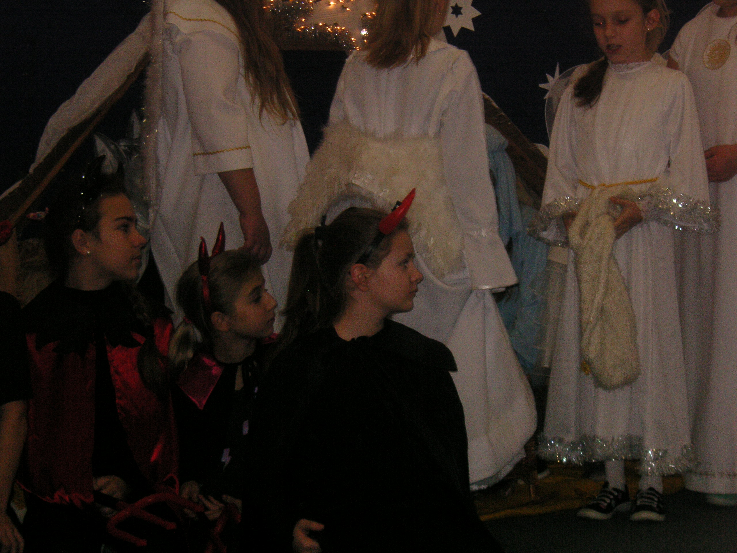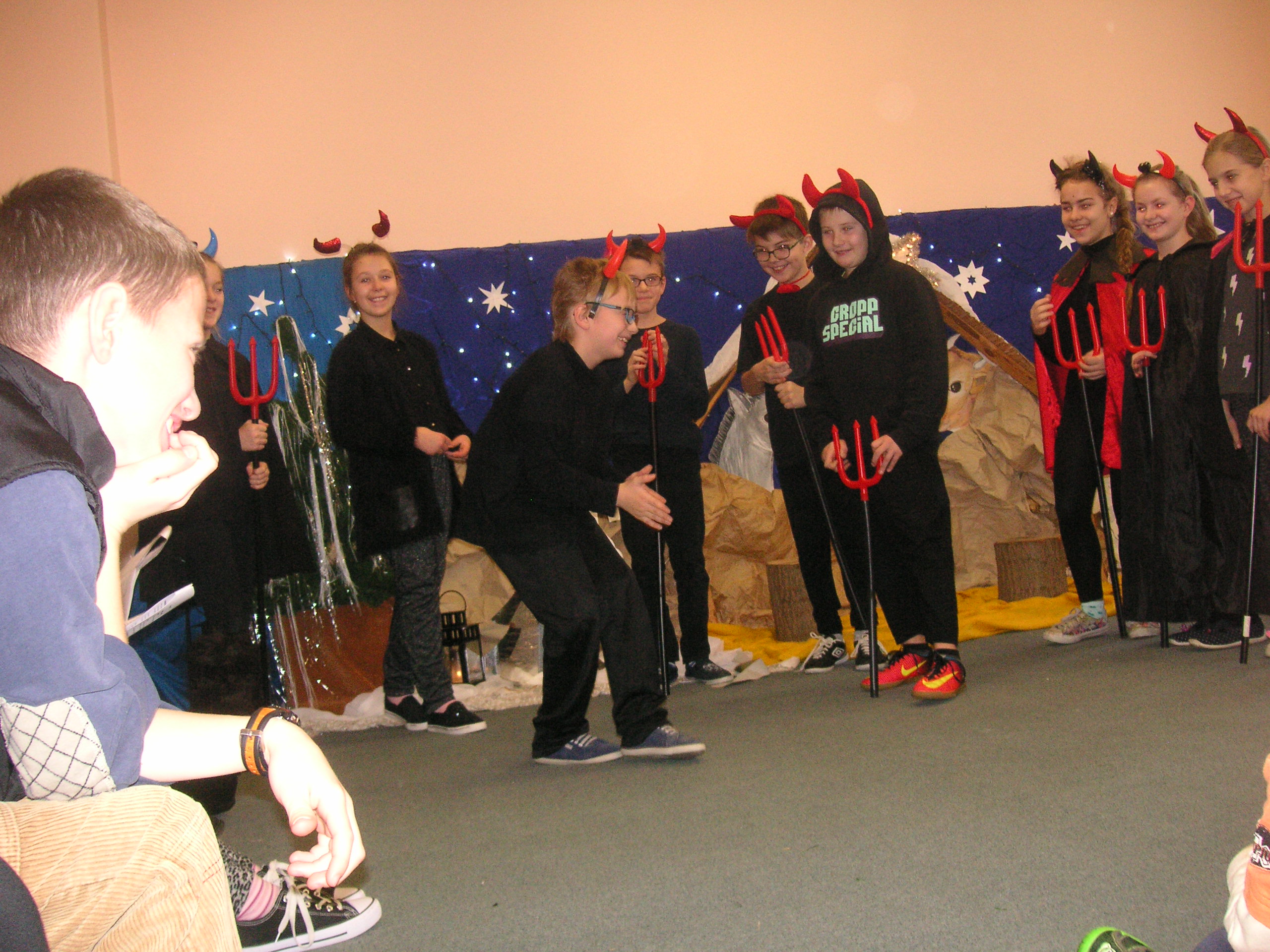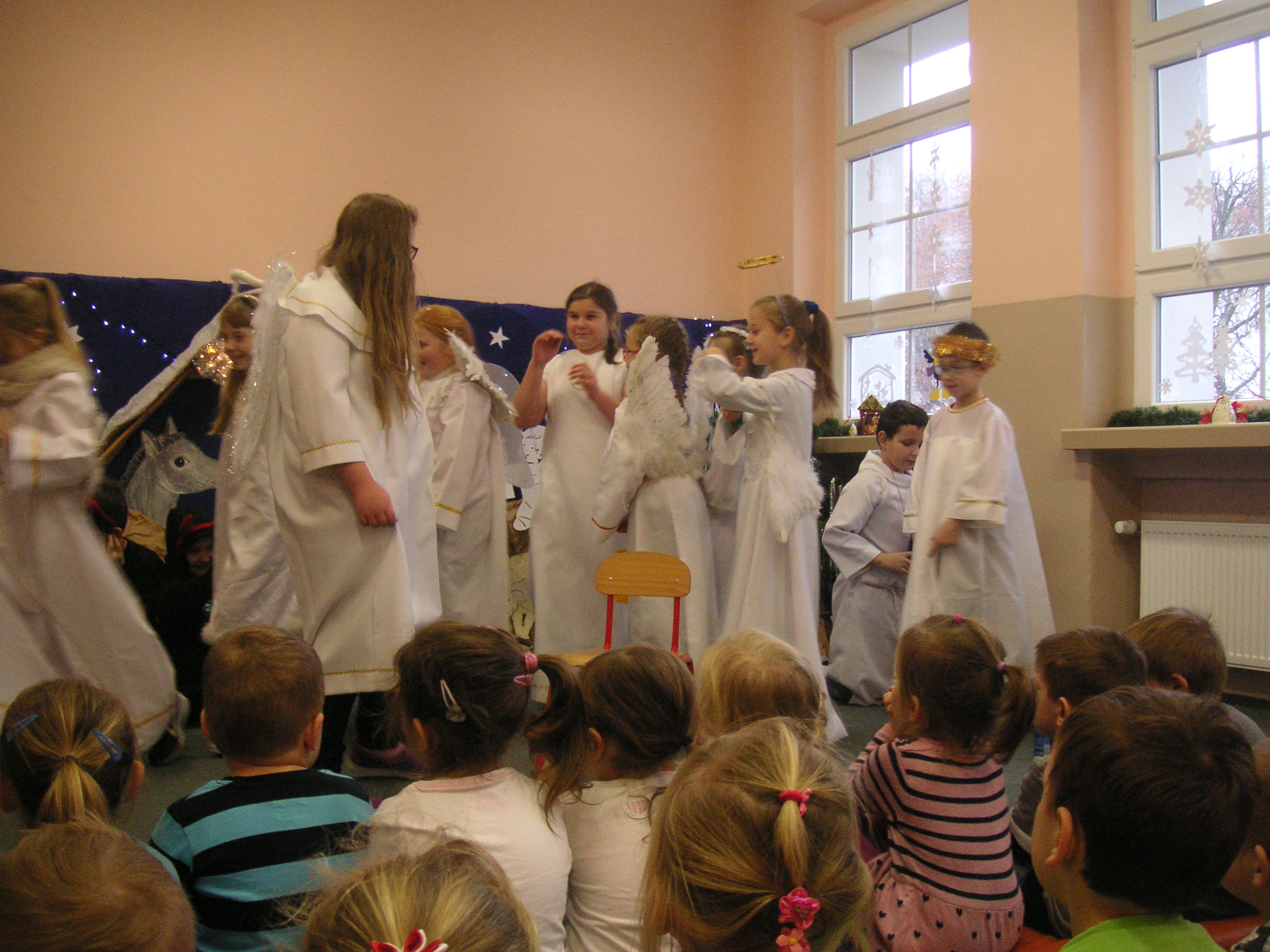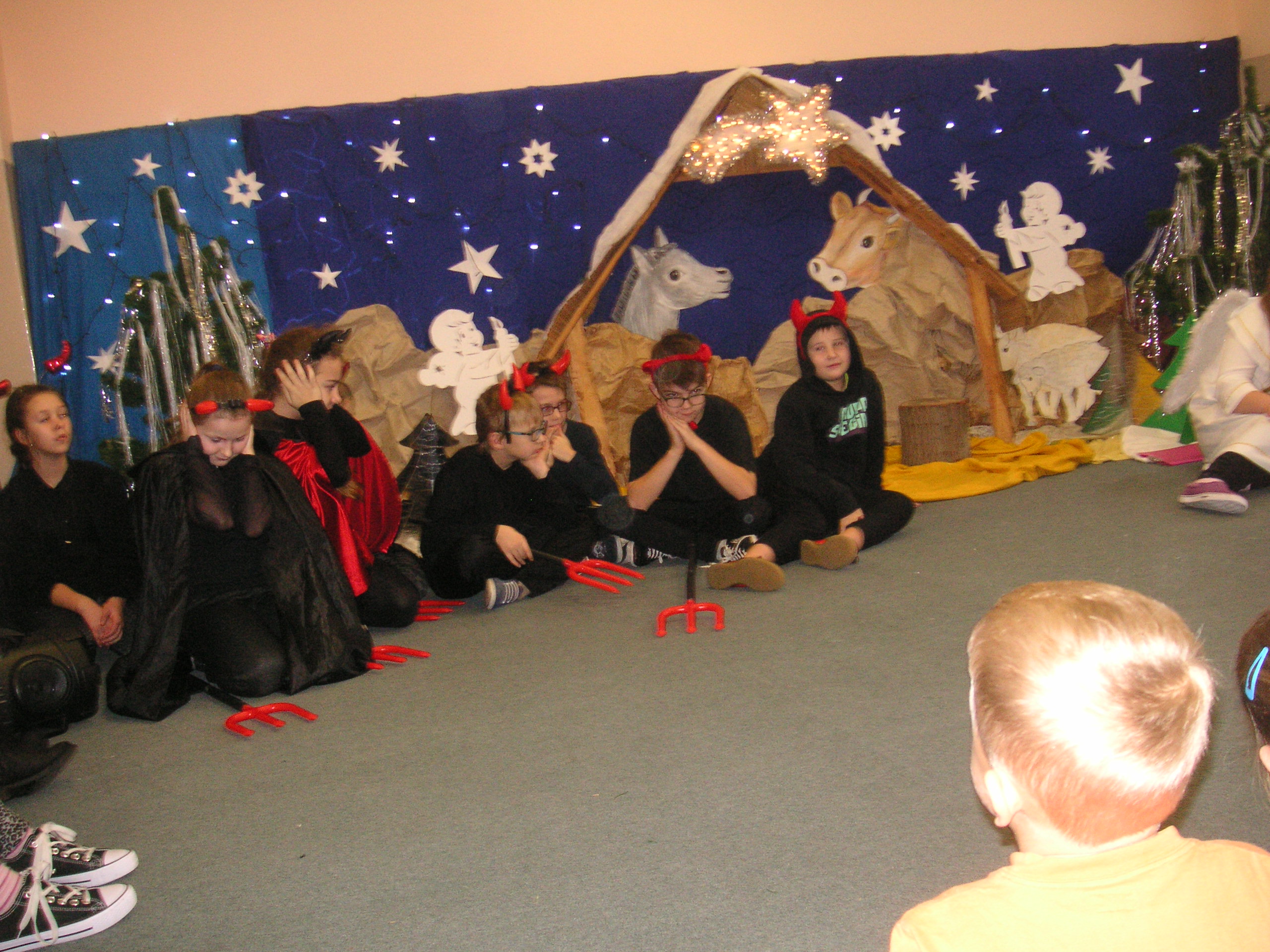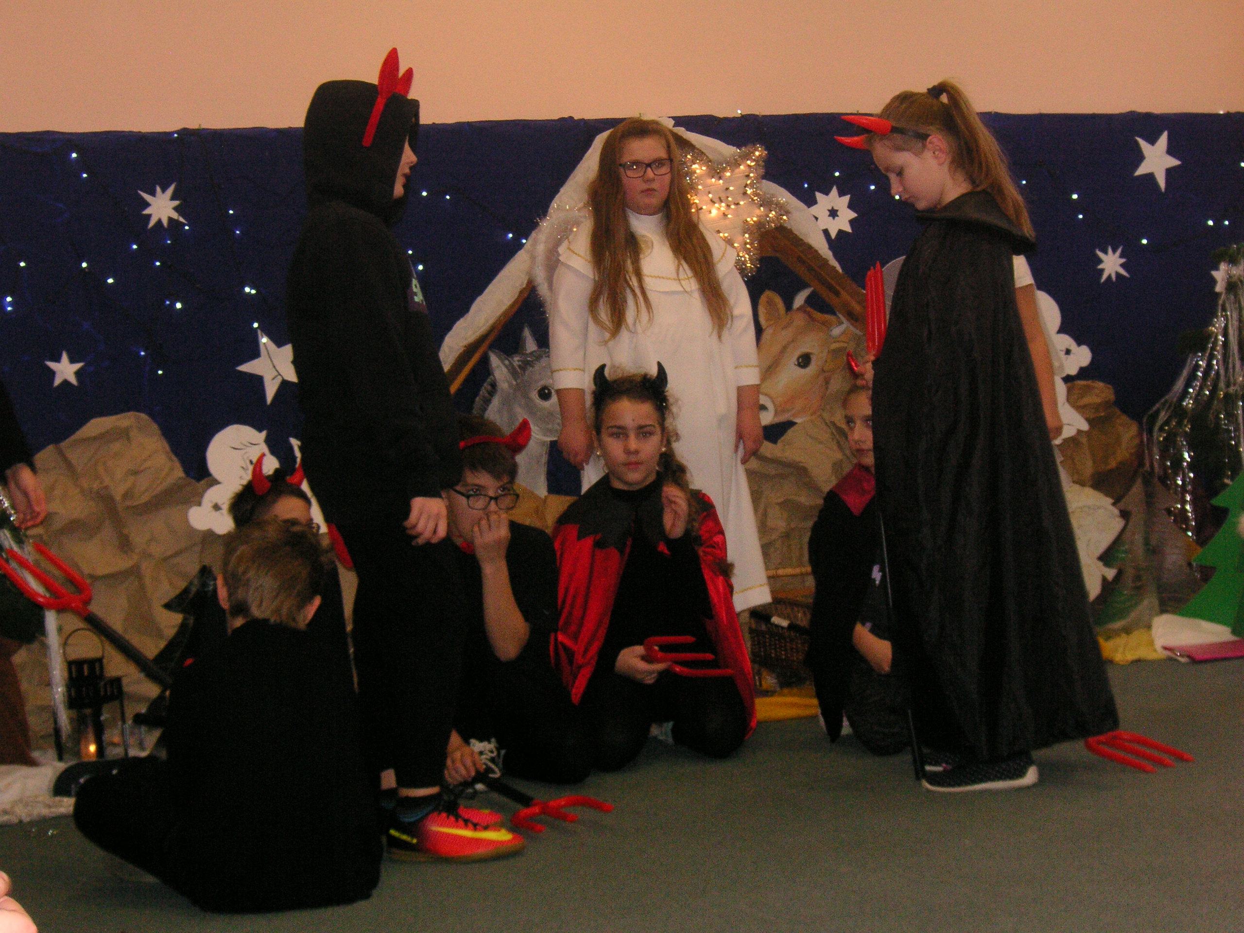 19 grudnia przybyły do naszego przedszkola diabły i anioły z Jasełkami. Uczniowie klas III-ich wraz ze swoimi nauczycielami, zaprezentowali przedszkolakom opowieść bożonarodzeniową. Dzieci z wielką uwagą i emocjami śledziły występy szkolnych kolegów. Miło spędzili z nimi czas, a otrzymane od uczniów świąteczne gwiazdki wywołały na buziach przedszkolaków szeroki uśmiech. Dziękujemy i zapraszamy ponownie.
