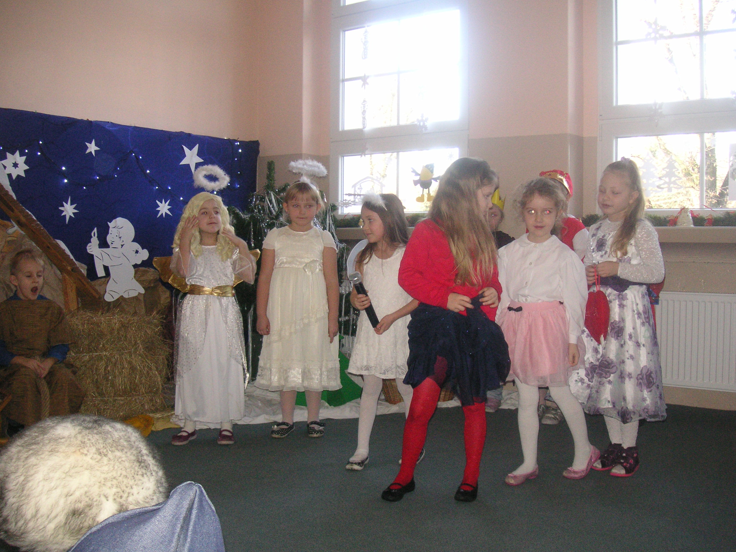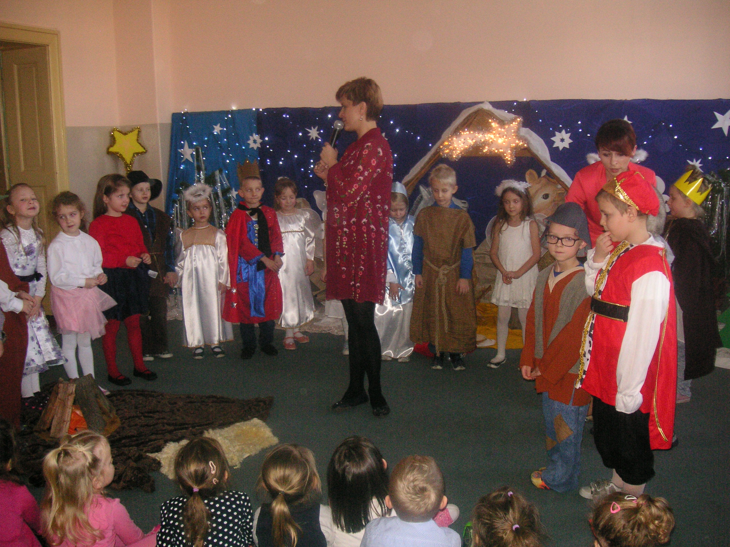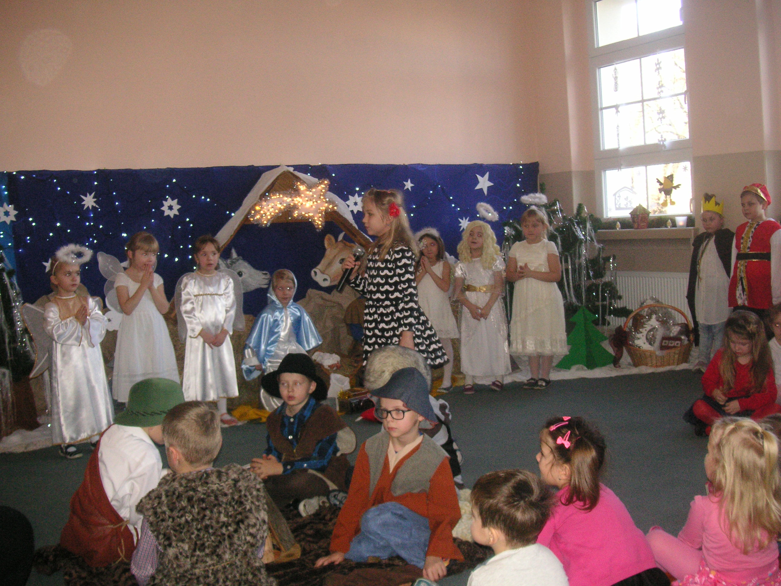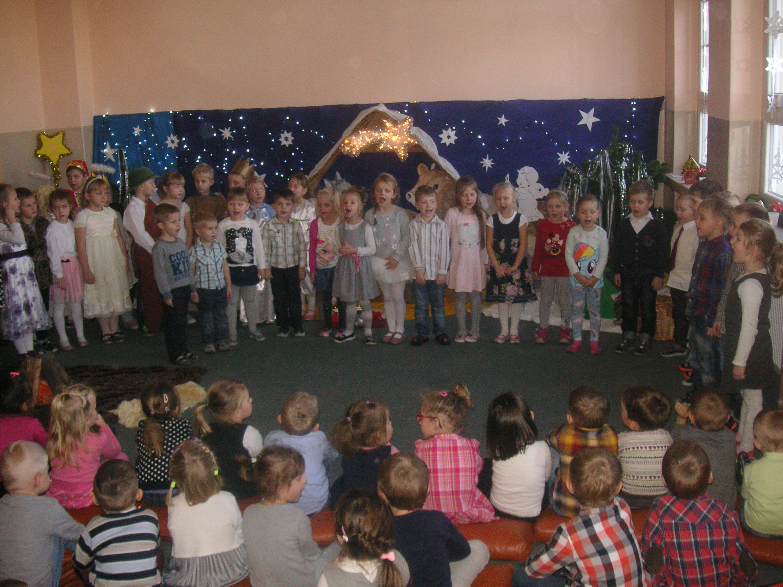Coroczne międzygrupowe spotkanie wigilijne uświetniły występy sześciolatków prezentując ,,Jasełka” w swoim wykonaniu. Później zaśpiewały świąteczną piosenkę dzieci z grupy pięciolatków. Na koniec były świąteczne życzenia, śpiew pastorałek i popularnych kolęd oraz drobne upominki i laurki. Spotkanie zakończyło się wspólnym poczęstunkiem przy świątecznych ciasteczkach. Było miło i radośnie, a nastrój oczekiwania udzielał się wszystkim uczestnikom.